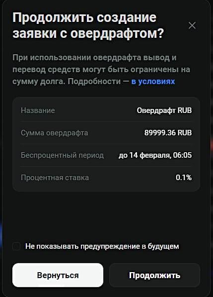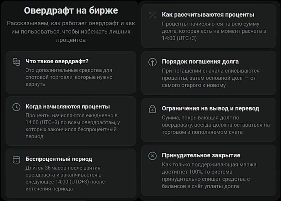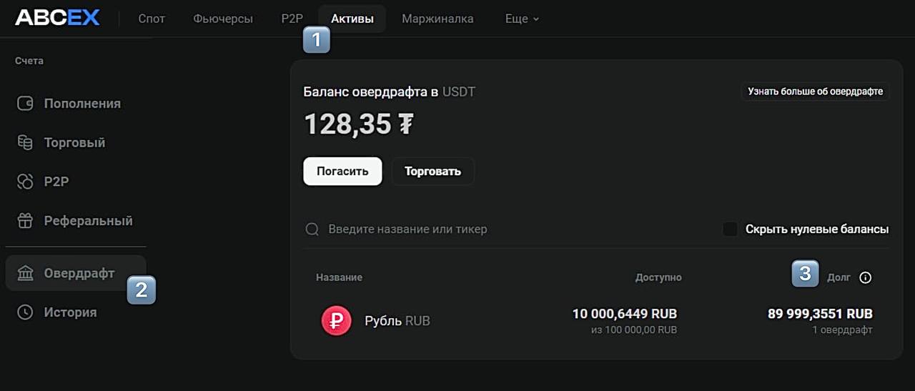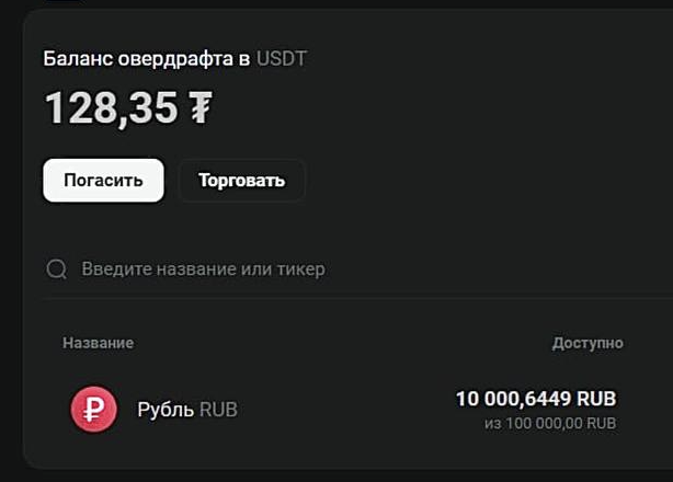 - Погашение долга по овердрафту требует использования той же валюты, в которой вы брали заём. Овердрафт в USDT - погашение в USDT. Овердрафт в RUB - погашение в RUB.