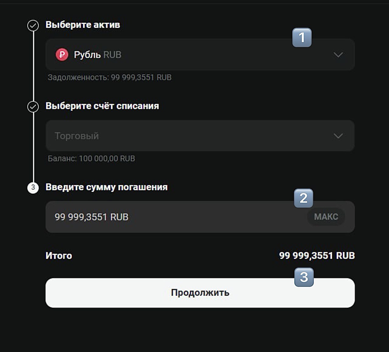 - Нажмите "Продолжить" для погашения овердрафта.