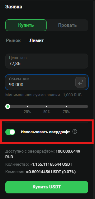Обратите внимание, что залоговый овердрафт доступен только для спотовой торговли в паре USDT-RUB. Для торговли в паре BTC-USDT овердрафт не доступен.